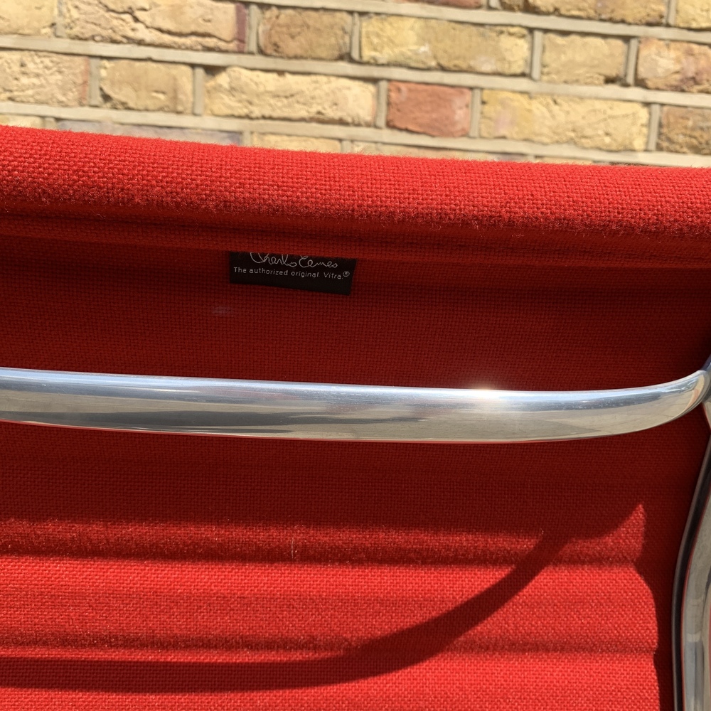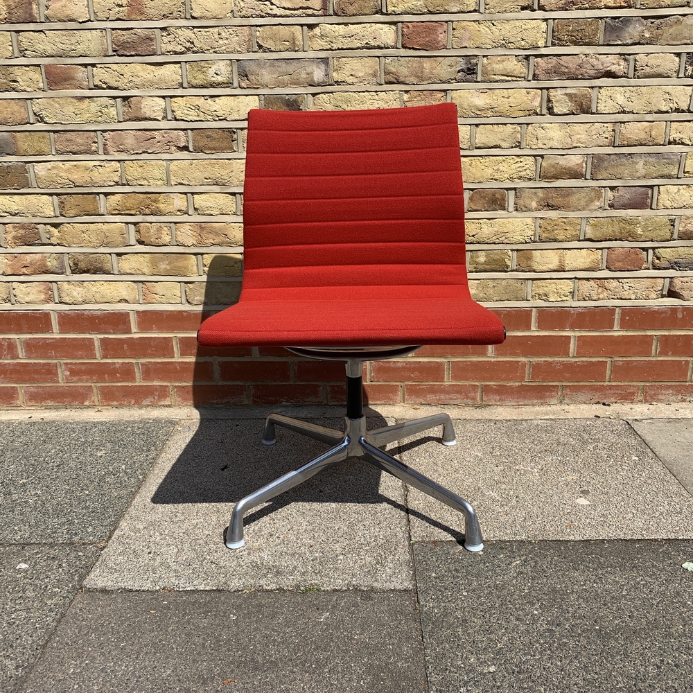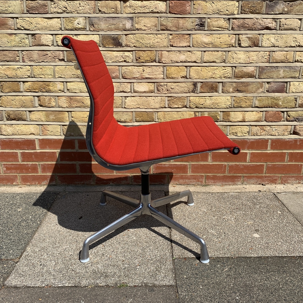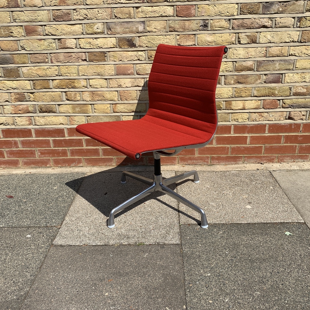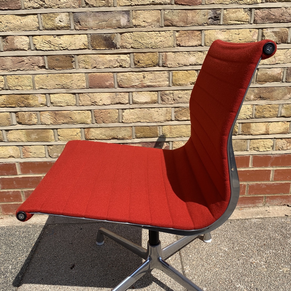 Charles and Ray Eames created an icon of the twentieth century with their design of the Aluminium Chairs EA 105-108. These famous classics are found in countless homes and living spaces around the globe. Aluminium Chair EA 108, Red Hopsak, Four Star Swivel Base with Glides.