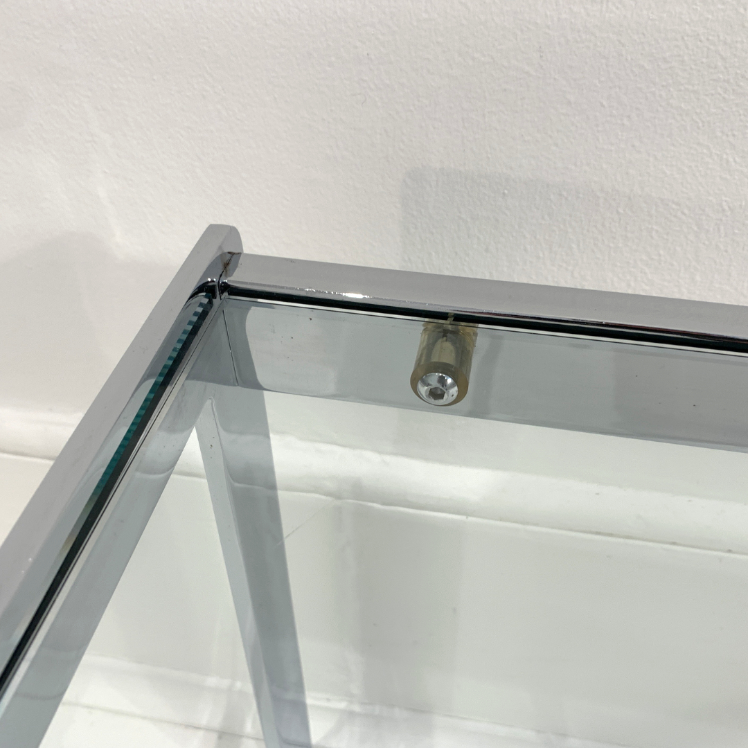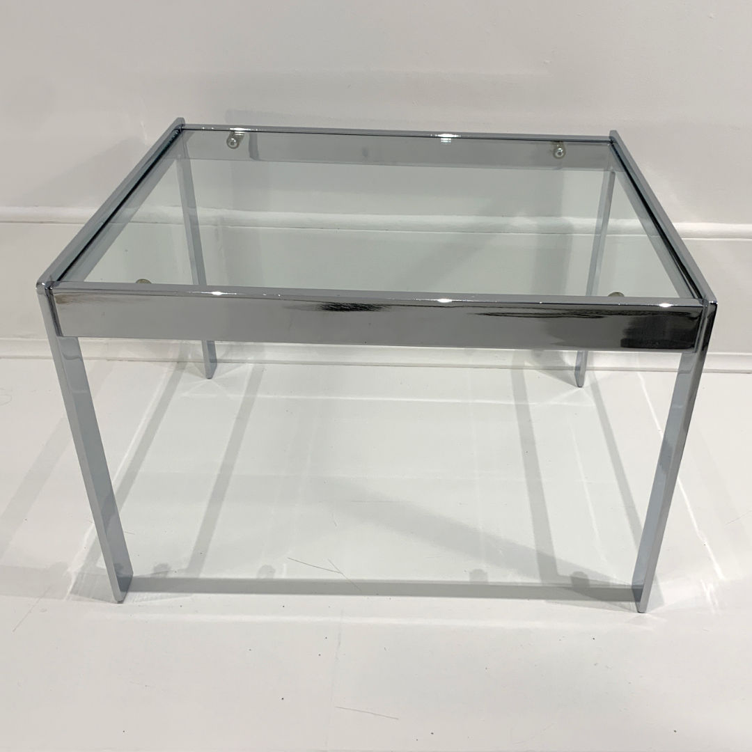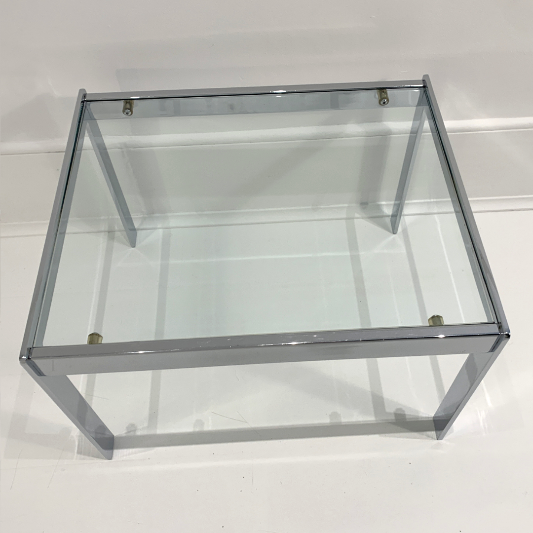 A small piece of British design history, created by Richard Young and produced by Merrow Associates in the 1960s. Ideal as a compact coffee table or side/end table. Features a sleek chromed steel base with a set-in glass top.