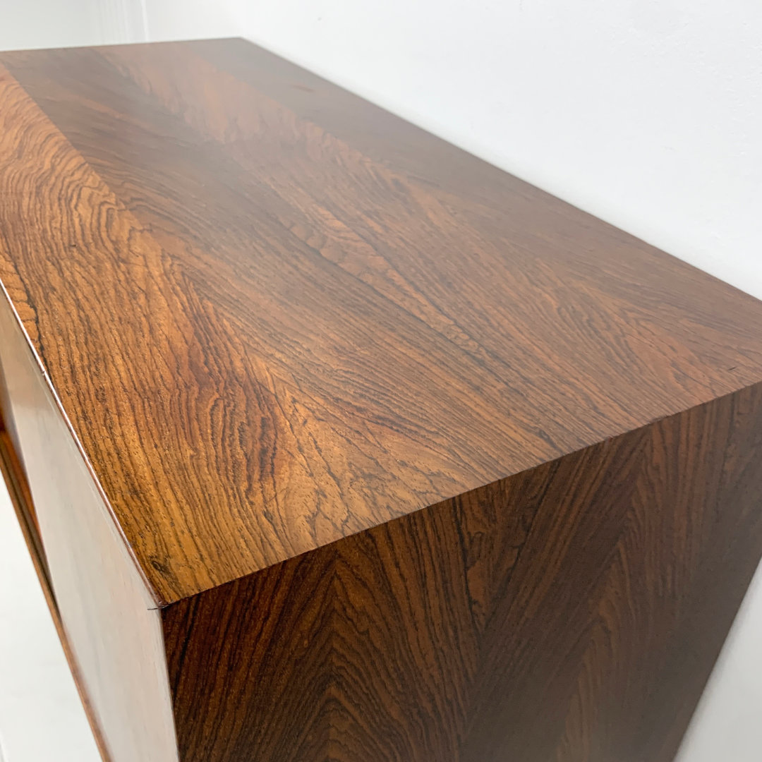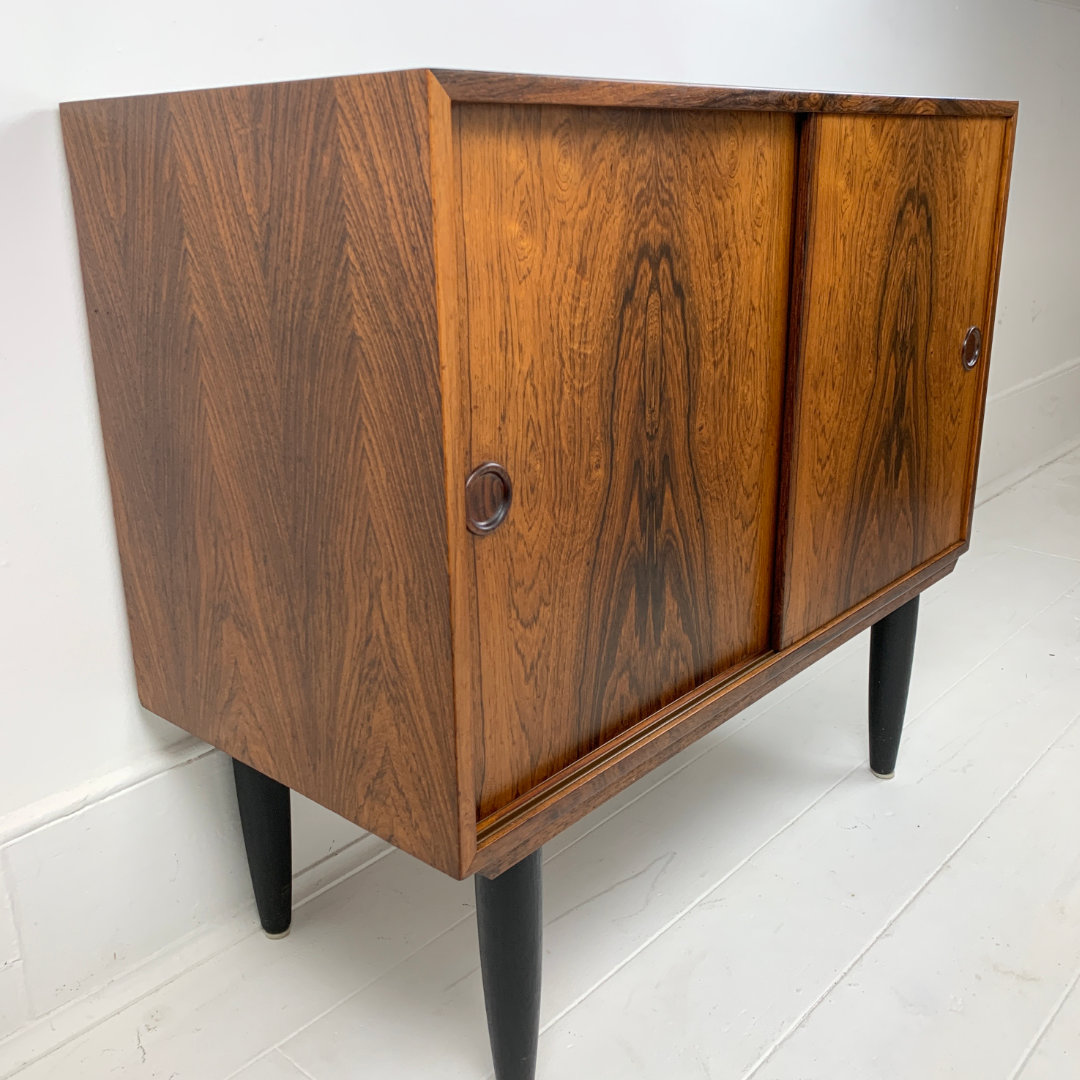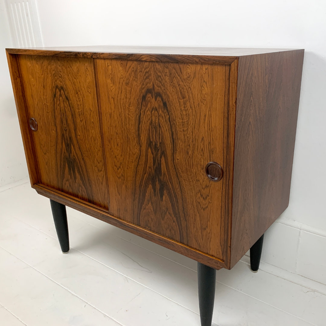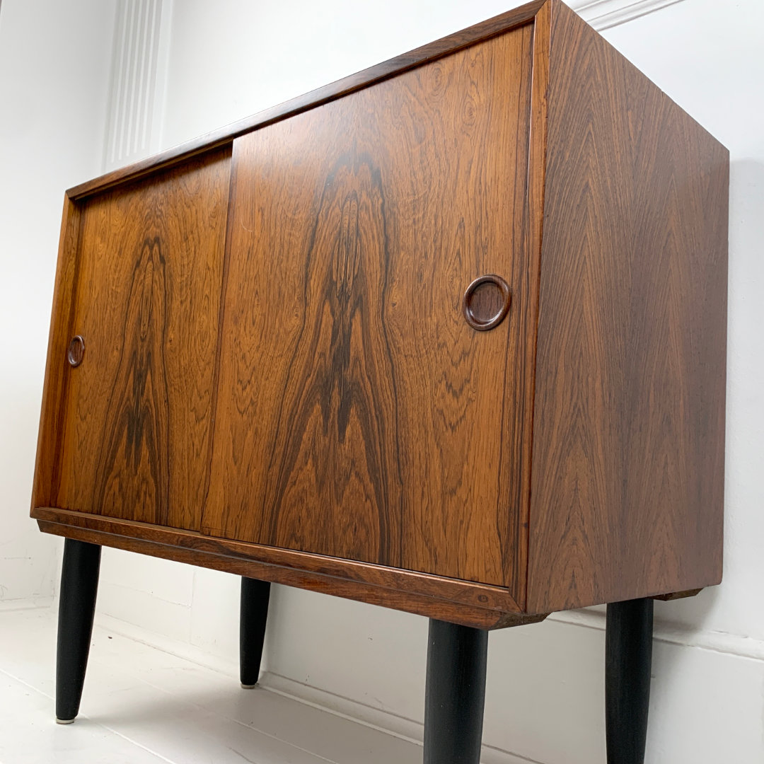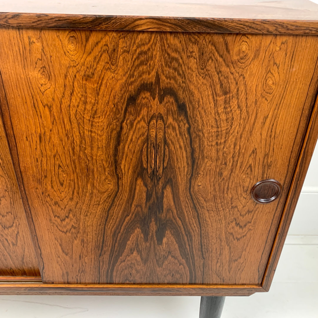 Beautiful mid-century modern Danish rosewood cabinet designed by Kai Kristiansen and made by Feldballes Mobelfabrik (FM). It features sleek sliding doors, a rich rosewood grain, and distinctive circular carved pulls. The interior is finished in rosewood veneer and includes height-adjustable shelves. The original maker's label is attached.